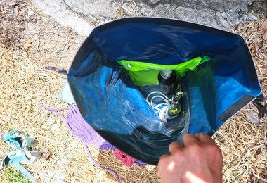 Wenn man den Ortovox Trad 30 Dry zum ersten Mal in der Hand hat, denkt man eher an einen wasserdichten Bootsbeutel für die nächste Raftingtour. Das sehr robuste Material wirkt anfangs etwas bockig, doch siehe da, beim ersten Einrollen des Rollverschlusses ist alles in bester Ordnung.