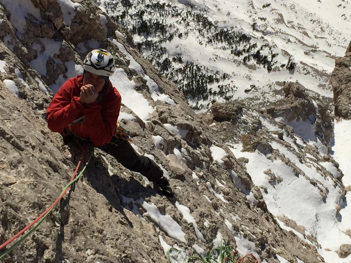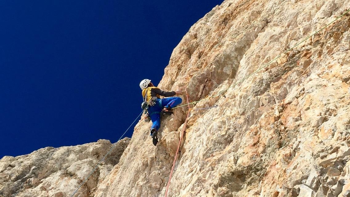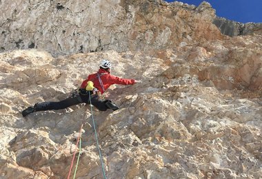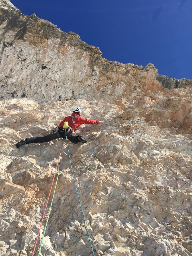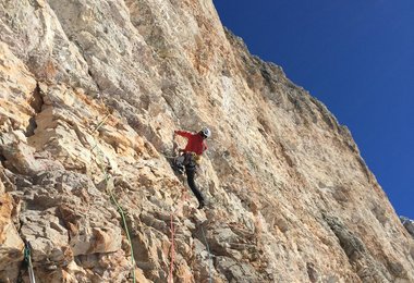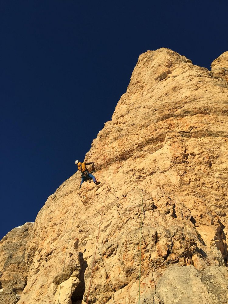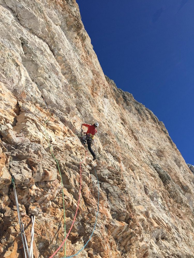 Da ich die Tour bereits 2007 mit meinen Bruder Manuel geklettert bin, konnte ich mich an die Linie in der Wand bestens erinnern. Die warmen Sonnenstrahlen, die uns am Wandfuß erreichten, hatten beinahe die selbe wohltuende Wirkung wie der Kaffee morgens in der Soctoni Hütte. Wie geplant, kletterten wir noch am selben Tag die ersten Längen und sofort war uns klar, dass wir am folgenden Tag mit unserer Biwakausrüstung zurückkehren würden.