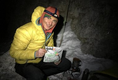 Erst am nächsten Morgen, nach einer Nacht mit Temperaturen von bis zu -18°C Grad, kam um 9:00 Uhr wieder Bewegung in unser Zelt. Gestärkt mit einem herzhaften Frühstück bestehend aus Schokolade-Müsli, gingen wir wieder zurück an unsere "Arbeit". Die letzten Meter erwiesen sich als purer Klettergenuss. Um 11:30 Uhr standen wir auf den Pfeilerkopf: „Berg Heil, die zwua Lausa:-)“.