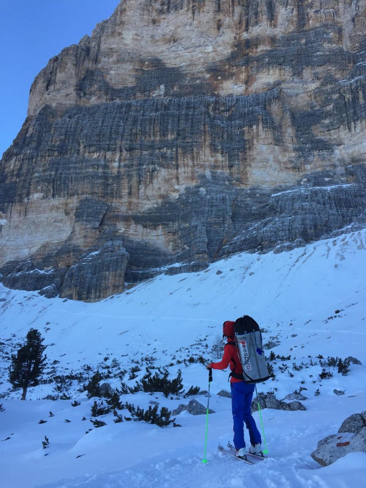 Am 17. Februar war es so weit und wir stiegen mit unseren Skiern zur Scotoni Hütte auf. Da es ziemlich kühl war und wir geplant hatten nur die ersten Seillängen zu klettern, freuten wir uns über die Einkehr in der warmen Hütte und gönnten uns noch einen heißen Kaffee. Am darauffolgenden Tag stiegen wir um 9:30 Uhr stiegen weiter auf und nach einer knappen Stunde standen wir am Einstieg.