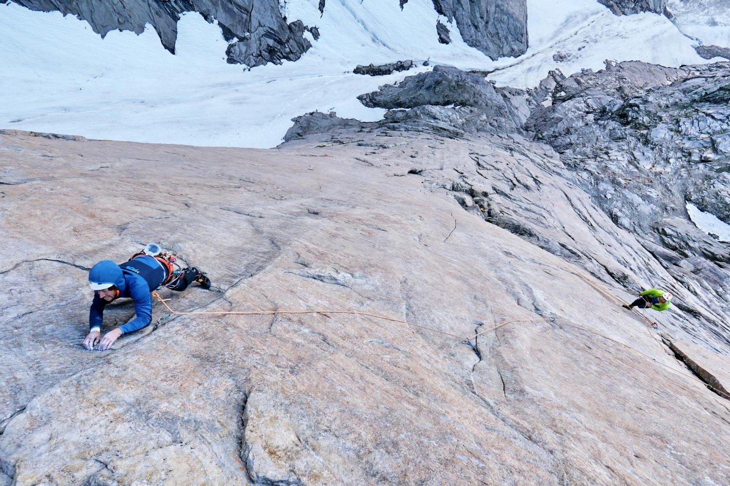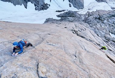 Nach fünf Tagen standen wir auf dem Gipfel. Da wir Zeit hatten, widmeten wir den sechsten Tag dem Klettern einiger Seillängen, die wir vorher noch nicht frei klettern konnten. Die Schlüsselseillänge ist ein Mix aus Wand – und Risskletterei, die wir mit 7c bewerteten. Insgesamt handelt es sich um eine eher psychologisch zu erschließende Route, da es keine offensichtlichen Sicherungsmöglichkeiten gibt, mit schönen vertikalen und überhängenden Seillängen.