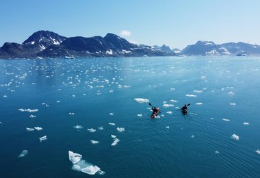 Nur 36 Stunden nach unserer Ankunft in Tasiilaq hatten wir die 200kg Essen und Ausrüstung in unsere drei Kayaks gepackt und taten das, wovon wir schon lange geträumt hatten: Auf eigene Faust auf dem arktischen Ozean paddeln und einen tollen Berg ansteuern.