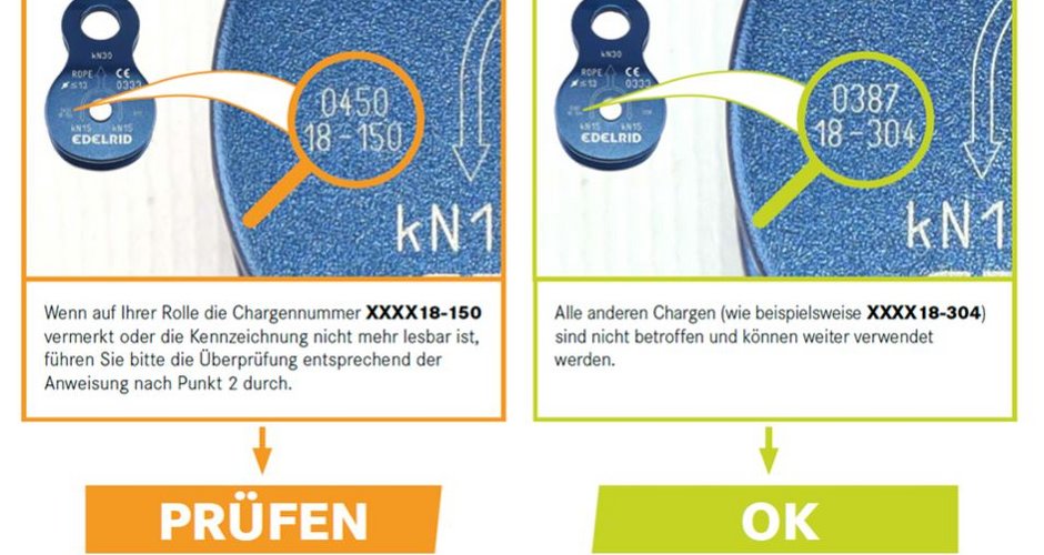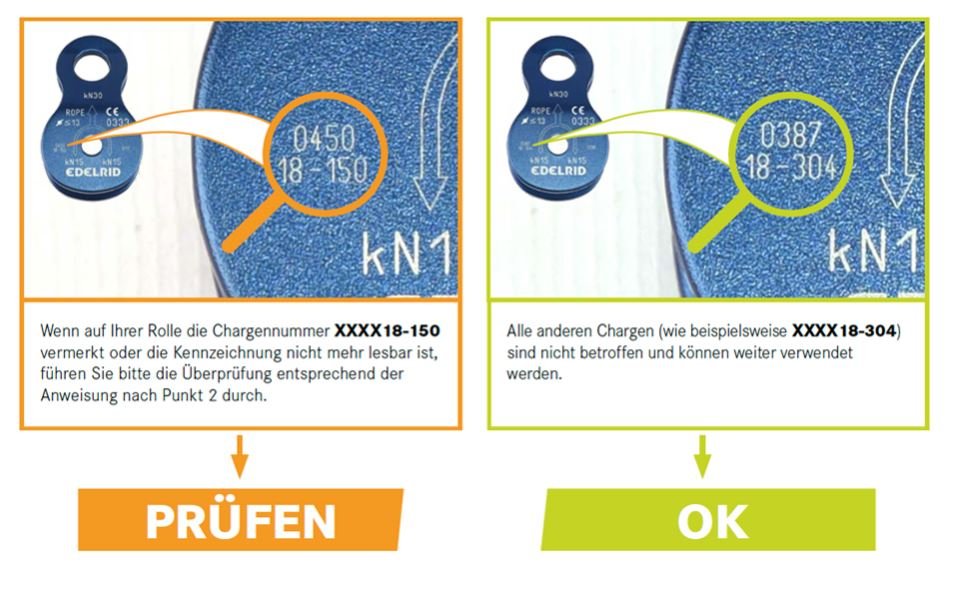 Eine betroffene Rolle muss umgehend der Nutzung entzogen und zum kostenlosen Austausch an EDELRID zurückgeschickt werden.