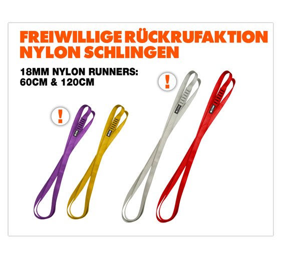 Ein Black Diamond Händler hat uns kontaktiert, nachdem er eine Nylon-Schlinge entdeckt hatte, die lediglich von Klebeband zusammengehalten wurde. Wir haben daraufhin die Produktion sowie die Auslieferung von Nylon-Schlingen sofort gestoppt und eine freiwillige Rückrufaktion/einen Aufruf zur Sicherheitsüberprüfung gestartet.