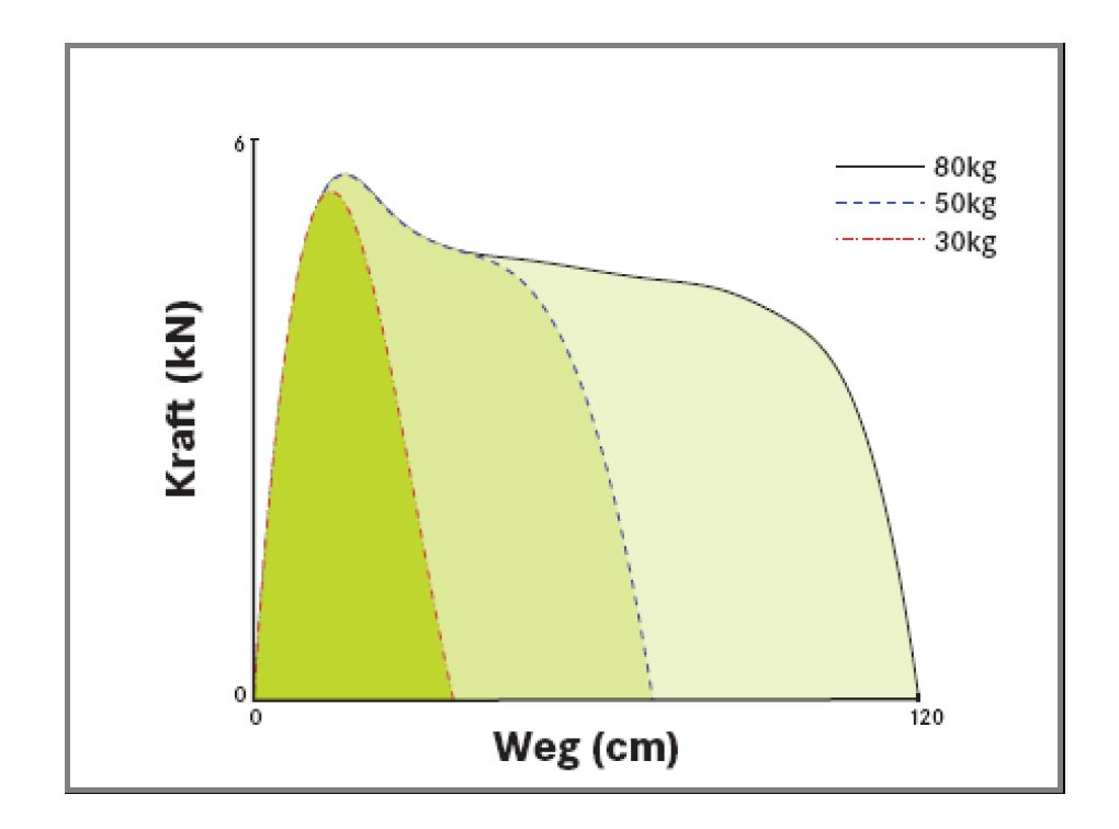 Die Vorteile liegen klar auf der Hand: Ein Klettersteigset, das für alle Benutzergruppen geeignet ist und spezifisch auf das eigene Körpergewicht eingestellt werden kann. Dadurch wird auch bei Kindern und leichtgewichtigen Personen ein deutlich längerer Bremsweg erreicht und der Fangstoß ist gerade noch so hoch wie unbedingt nötig (siehe Abbildung 3). Schwerwiegende Verletzungen durch Nichtauslösen des Falldämpfers werden somit vermieden. Somit ist das Cable Vario für Personen ab einem Körpergewicht von 30 kg geeignet.