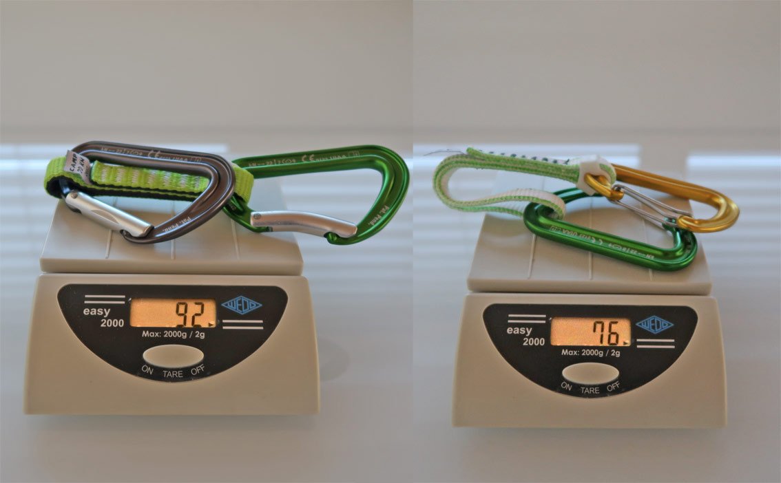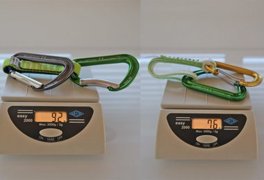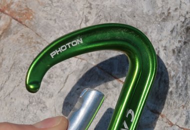 Positiv sticht das Gewicht bei den Photon-Expressschlingen heraus, sie wiegen unter 100 Gramm (genau genommen 92 Gramm) und das bei normaler Karabinergröße. Man hat also keine „Minikarabiner“ in der Hand, sondern einen leichten, eigentlich sogar groß wirkenden Karabiner, der sich sehr gut in die Bohrhakenlaschen einhängen lässt. Der Photon hat keine Nase, sondern einen Keylook-Verschluss - es können sich also weder das Seil noch andere Sachen (Klemmkeile, Schlingen etc...) in der Nase verkeilen (hängen bleiben). Aufgrund des sehr schmal konstruierten Verschlusses sind auch schlecht platzierte Normalhaken oder andere, mit kleineren Öffnungen, gut einzuhängen. Aufgrund der guten, handlichen Karabinerform tut man sich auch beim Einhängen von weit oben platzierten Bohrhaken etwas leichter.