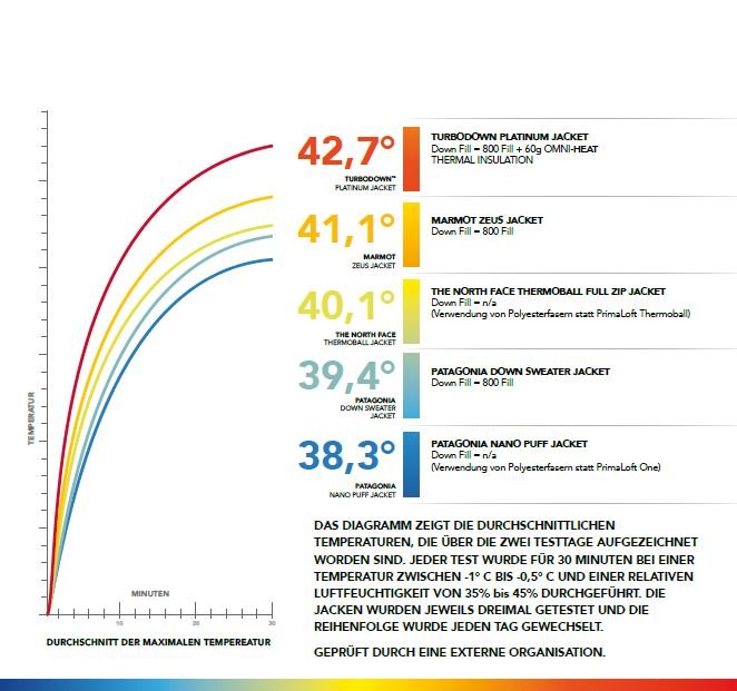 Zum Beispiel gibt es dann Angaben von 860 TD (800 Daunenfüllung + 60g Omni-Heat Thermal Reflective-Isolierung) bis 890 TD (850 Daunenfüllung + 40g Omni-Heat Thermal Reflective-Isolierung).
