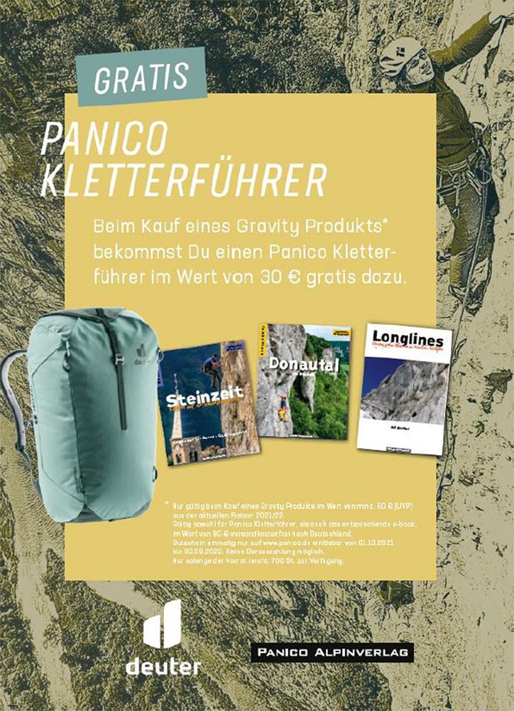 Der Panico Gutschein ist einmalig auf www.panico.de im Zeitraum von 01.10.2021 bis 30.09.2022 einlösbar und gilt sowohl für Panico Kletterführer als auch das entsprechende e-book. Eine Barauszahlung ist nicht möglich.