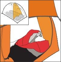 Nemo hat auch ein herkömmliches (also mit Alugestänge) „4 Season“ Zelt im Programm – beim Tenshi sticht vor allem der Kondensations-Vorhang hervor – dieser teilt den Schlafbereich in zwei Teile und hält die Feuchtigkeit von den unteren Körperteilen fern.