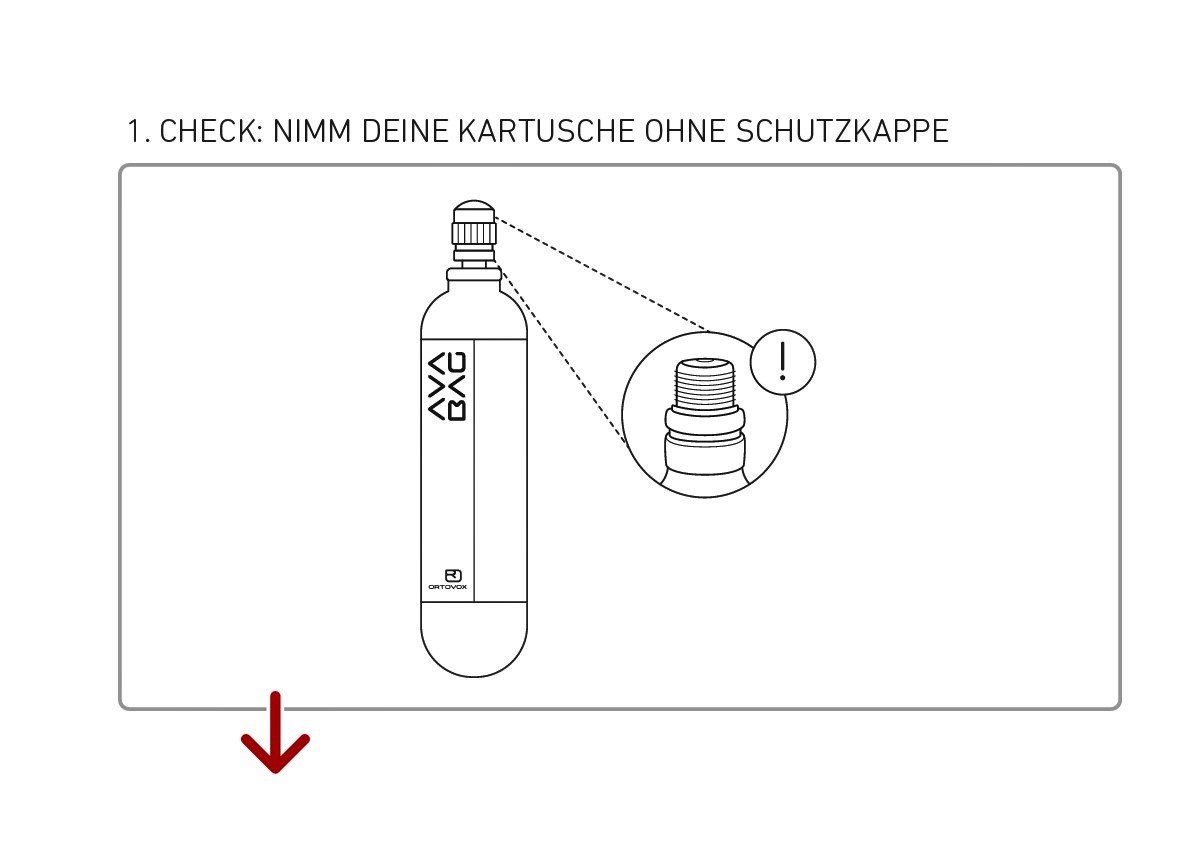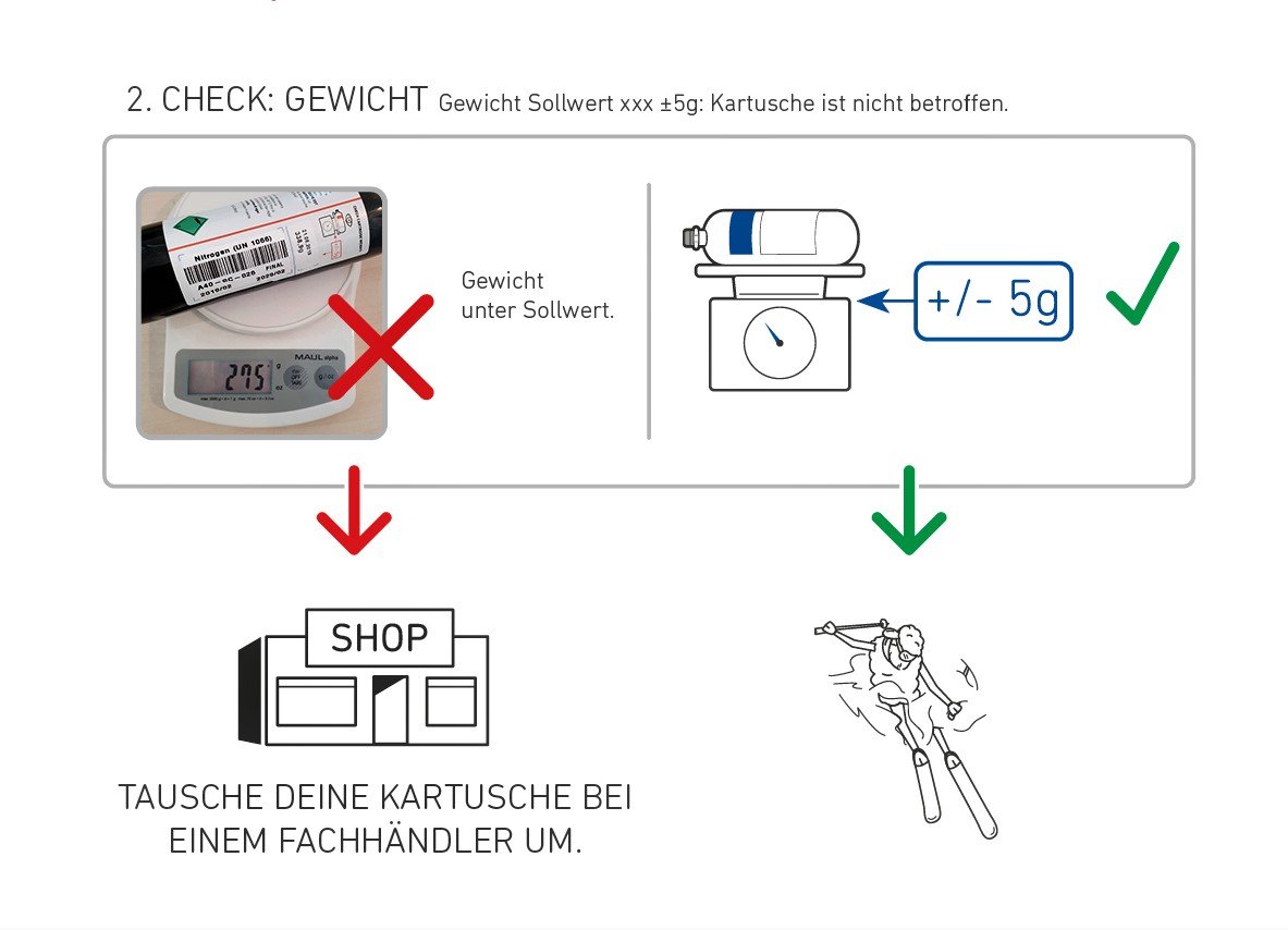 Eine detaillierte Beschreibung dieser Prüfung findet sich in der Bedienungsanleitung zu jedem Avabag-Airbag Rucksack sowie zusätzlich u.a. unter https://www.ortovox.com/de-de/service/infos-und-services Kartuschen, die im Rahmen der Wiegeprüfung keinen Druckverlust aufweisen, können unmittelbar nach der Prüfung bedenkenlos verwendet werden. Betroffene Kartuschen mit Druckverlust können beim Fachhändler ausgetauscht werden.