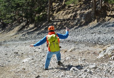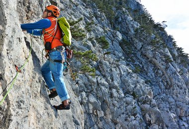 Beim Klettern kann man den Rucksack gut mit dem Brustgurt stabilisieren, den Beckengurt verwenden wir nicht, da man so besser an die Ausrüstung am Klettergurt kommt. Nur optisch könnte der Rucksack noch etwas "komprimierter" anliegen, vom Tragekomfort her sitzt der Core 35 wie schon gesagt perfekt. Die Schulterträger sind ein Mittelding zwischen breit und dünn, in Kombination mit dem flachen Rückenelement fühlt sich das gut am Rücken an. Die obere Abdeckung mit den beiden Deckeltaschen wird mit einem kleinen Karabiner fixiert, vorne am Rucksack lassen sich bei Bedarf noch zwei Eisgeräte befestigen. Mehr Befestigungsschlaufen gibt es aber nicht, was gut ist!