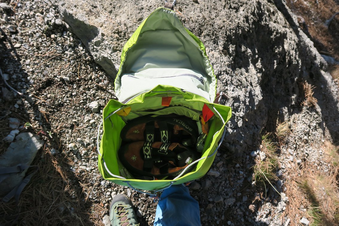 Das Core Modell wird in 25 Litern (700 g) und 35 Litern (830 g) angeboten - wir haben uns für die 35 Liter Version entschieden, da man mit diesem Teil die meisten Sachen im Rucksack transportieren kann und nichts aussen dranhängen muss. Auch fallen die beiden Deckeltaschen beim Core 35 Liter Modell geräumiger aus als beim kleineren Core 25 Liter Modell. Trotz der "großen" 35 Liter und der fehlenden Kompressionsbänder liegt der Core Rucksack beim Klettern sehr gut auf dem Rücken, man spürt ihn kaum, er lässt sich mit dem Karabiner-Verschluss gut verkleinern.