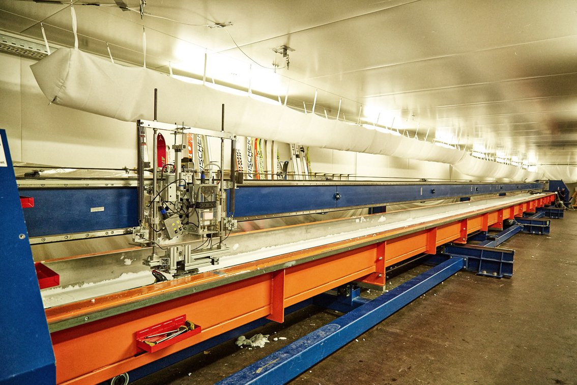Das Herzstück der Anlage ist aber das Tribometer. Eine lange Testbahn mit immer gleichem Kunstschnee in einem langen temperierten Raum auf der man bei Fellen den Reibungskoeffizient messen kann. Der Energieaufwand, der beim Aufstieg ein ernstzunehmender Faktor ist, erhöht sich klar bei Fellen mit einer hoher Reibung - man braucht man also mehr Kraft um schlussendlich auf dem Gipfel zu stehen.