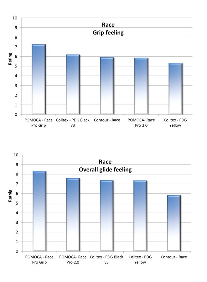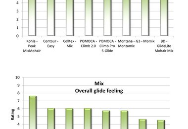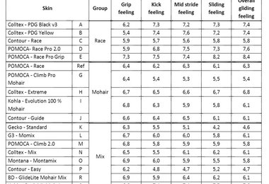 Die Ergebnisse wurden für jedes Fell in einen Bewertungsbogen eingetragen (in einer zehnstufigen Skala von 1=sehr schlecht bis 10=sehr gut), überraschend war für uns persönlich, dass man mit Rennfellen und dünnen Rennskiern eigentlich genauso gut bergauf steigt, aber deutlich besser gleitet. Beim Grip war „Grip“ und „Gripfeeling“ anzukreuzen, beim Gleiten war die Startphase (Kick), der Mittelteil (Mid Stride) und das Ausgleiten (Sliding Feeling) zu beurteilen, ganz unten wurde auch beim Gleiten eine „Overall“ Bewertung abgegeben.