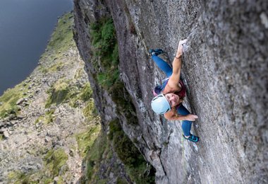 „Inzwischen benutze ich für 90 % der Trad-Routen einen Helm“, sagt Hazel. „Die Gefahr von losem Gestein, das Einfädeln des Beines hinter dem Seil oder ein weiter Sturz durch Ausreißen von mobilen Sicherungen ist bei diesem Kletterstil generell größer.“