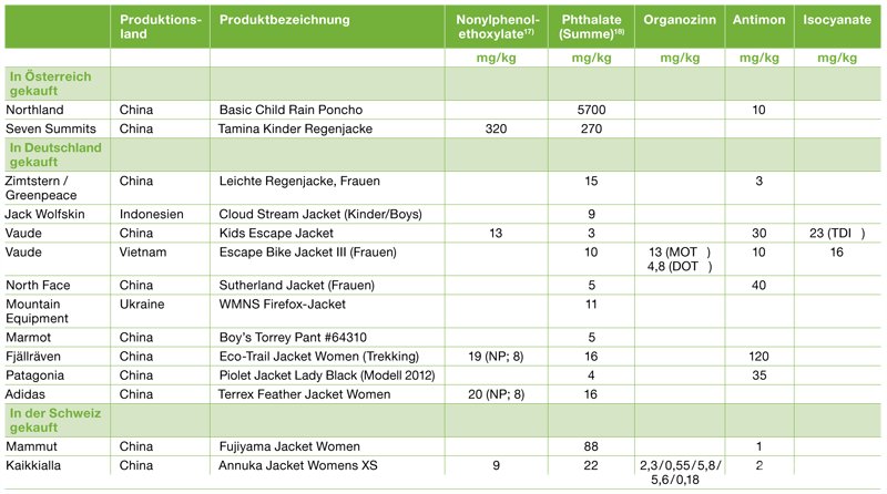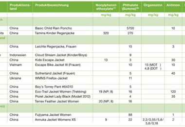 Der Test ergab außerdem eine besorgniserregend hohe Konzentration von Nonylphenolethoxilate (NPE) und Weichmachern, sogenannten Phtalaten. Der höchste NPE-Gehalt wurde in einer Kinder-Regenjacke von Seven Summits gefunden.
