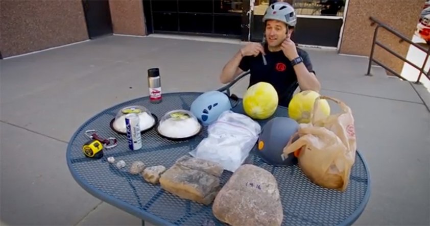 Das amerikanische Climbing Magazin testet Helme einmal ganz anders. Originell und mit viel Einfallsreichtum werden die Vor- und Nachteile der einzelnen Helme anschaulich in einem kurzen Video dargestellt. Die Gewichte werden langsam gesteigert, die Auswirkungen auf den Helm und die darunter befindliche Melone werden gut sichtbar dargestellt.