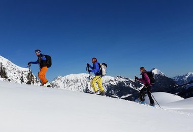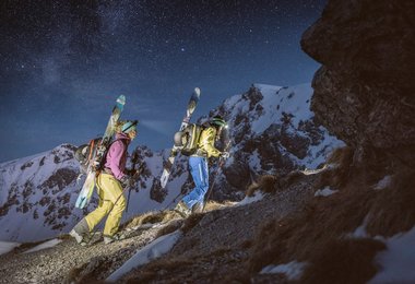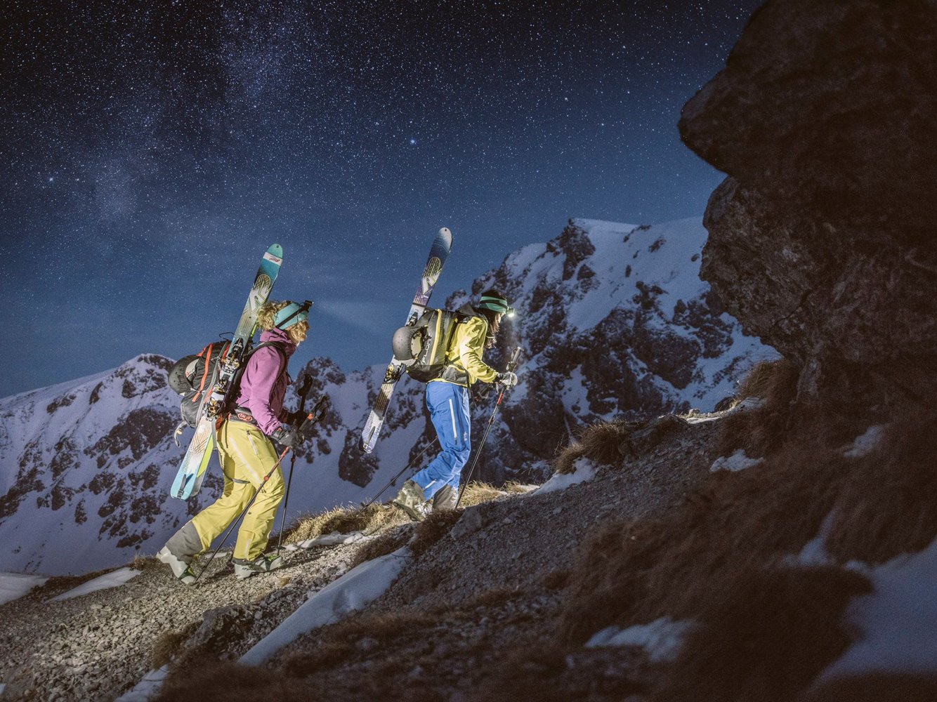 Am frühen Nachmittag sitzen wir wieder im Auto Richtung Gesäuse. Dort ragt auch der namensgebende Berg "der Lugauer", das sogenannte Matterhorn der Steiermark, beeindruckend empor. Dort wollen wir am nächsten Morgen die Hose und Jacken testen. Als wir uns gegen 14:00 Uhr dem Gesäuse nähern, fragt Andi nach dem Mondstand und nach unseren Stirnlampen und eine gute Stunde später sind wir bereits beim Aufstieg zum Kaibling. Es ist kalt, windig und angeführt von Stefan, der als Bergführer Hyphen seit der Geburt der Marke auf Herz und Nieren testet, geht’s bergaufwärts. Die Jampspitz Jacke sitzt perfekt und ist absolut winddicht. Bei der Abfahrt setzen wir die Stirnlampen auf und auch hier merkt man, dass die Entwickler bei der Kapuze an Nachtabfahrten gedacht haben. Am nächsten Morgen geht es im Johnsbachtal nochmal nordseitig auf das Blaseneck. Hose und Jacke passen sich perfekt unserem Körper an und werden von den überholten Tourengehern bestaunt. Auf dem Gipfel können wir auch zum Lugauer hinüberschauen, der mit seiner berühmten Lugauer Plan die Königisskitour im Johnsbachtal darstellt und ein ebenbürtiger Namensgeber ist. Nach der Abfahrt geht’s ohne Zwischenstopp auf den nächsten Gipfel hinauf. Testen, testen, testen und das, obwohl wir eigentlich schon überzeugt sind.