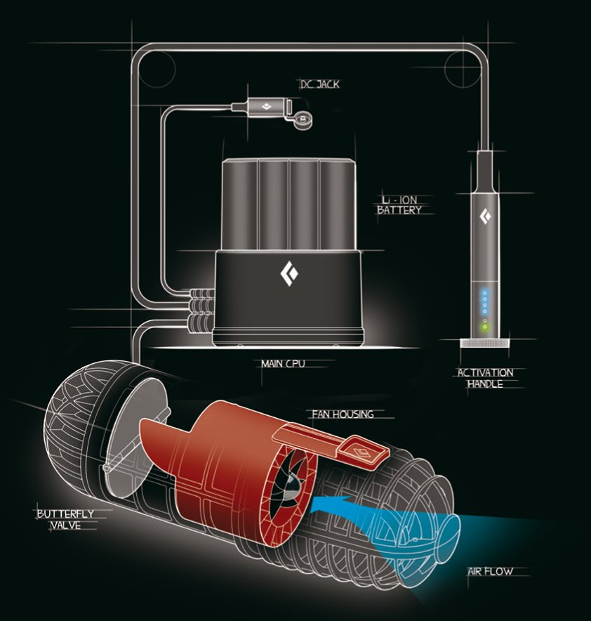 JetForce ist die erste Lawinenairbag-Technologie mit Düsengebläse, ein bahnbrechendes System, das Luft aus einer unbegrenzten Quelle entnimmt – der Atmosphäre. JetForce kann getestet, neu gepackt und auf Reisen mitgenommen werden. Dieses System ist ein Ergebnis der langjährigen Zusammenarbeit von Black Diamond und Pieps, zwei führende Innovatoren im Bereich der Lawinensicherheit.