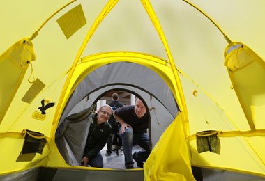 Gewicht ist beim Zelt weiterhin ein wichtiges Thema, muss man es doch tagsüber im Rucksack transportieren können. Gerade mal 770 Gramm wiegt das derzeit leichteste Ein-Personen Zelt, das "Telemark 1" von Nordisk. Ultrafeines "10 Denier Nylon", Karbon-Gestänge, Titan-Heringe und Abspannleinen aus Kevlar sorgen für die Windstabilität. Etwas schwerer, aber für drei Personen geeignet, ist das "Exolight III" von Jack Wolfskin, das weniger als zwei Kilo auf die Waage bringt. Im Gewicht dazwischen lässt sich das "Essence Ultralite II" von Salewa einordnen. Die Designer aus Bozen haben erneut die Idee des Single-Wall-Zeltes aufgegriffen. Herausgekommen ist ein Zelt für alle Klimazonen von Dschungel bis Alpin, ohne dass es sich zur "Tropfsteinhöhle" entwickelt.