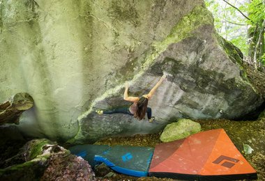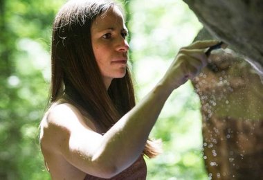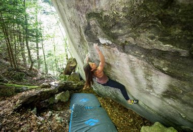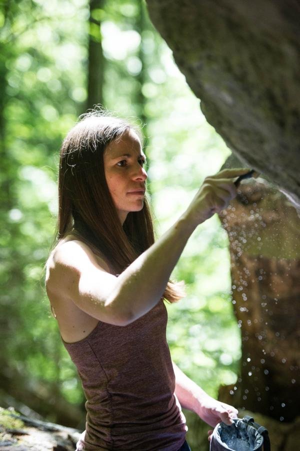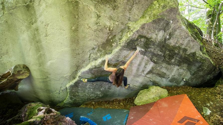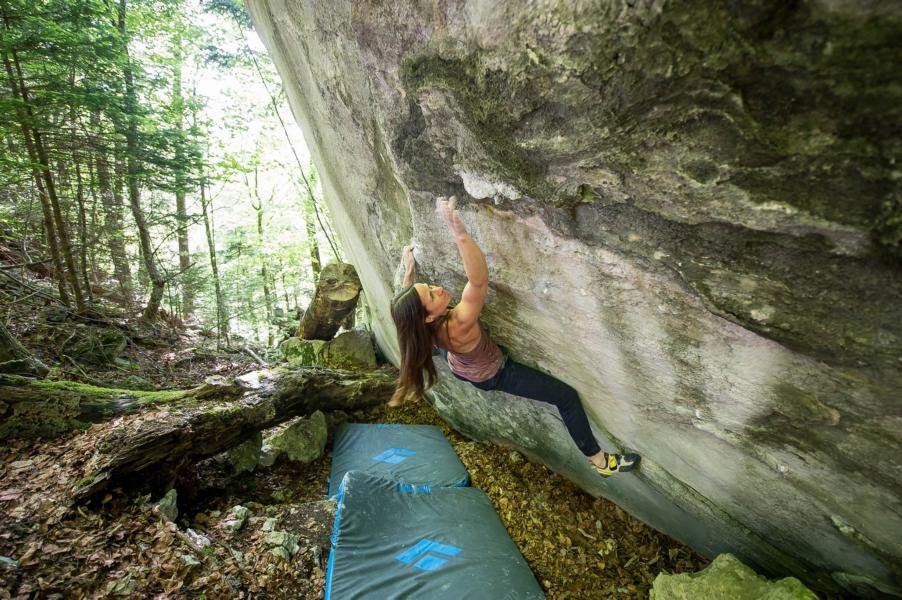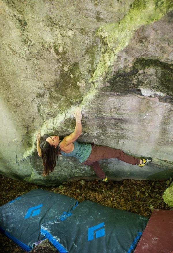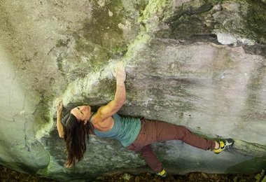 Als weltweit erst zweite Frau klettert Katrin (Kaddi) Lehmann ein Boulderproblem im Schwierigkeitsgrad 8c.