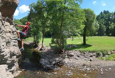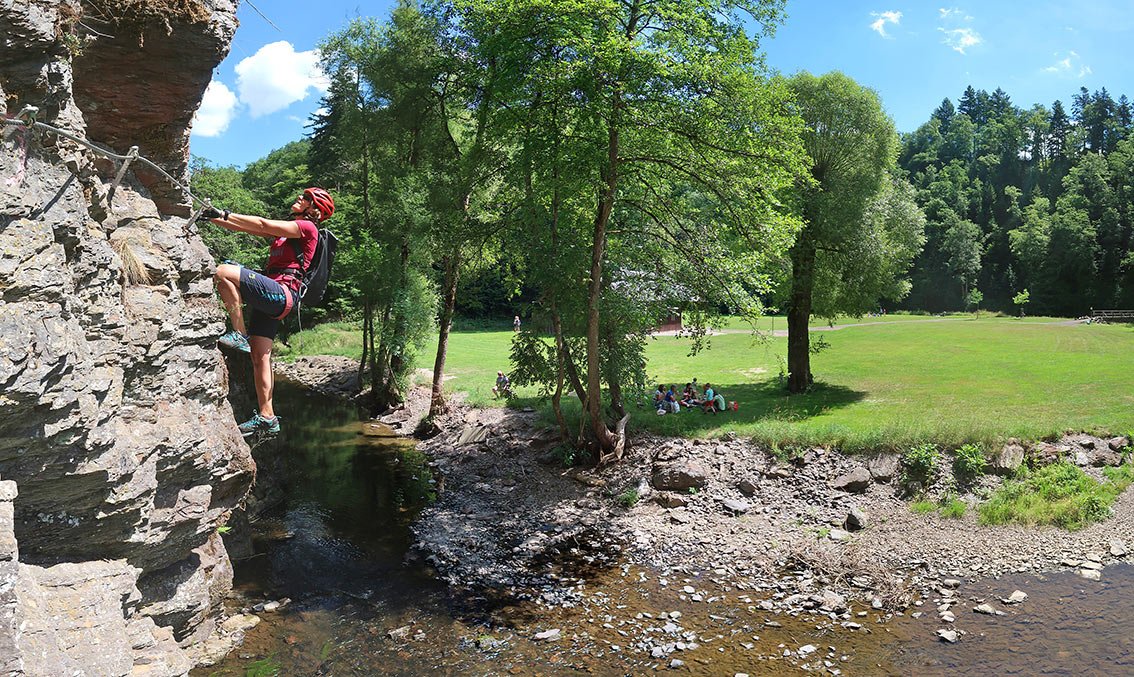 Die Vulkaneifel in Reihnland-Pfalz ist vielen nur von Wanderungen (Eifelsteig), Radfahren und von den malerischen und zum Baden idealen Vulkanseen bekannt. Als neues Klettersteig Zentrum in Norddeutschland kann man getrost Manderscheid bezeichnen. Wurde doch mitten im Ort, wunderschön angelegt zwischen Burgen und entlang der Eifel eine richtig gute Ferrata gebaut. In drei Etappen geht man - beziehungsweise klettert man - zuerst entlang des Baches, dann hinauf zur Burg (es heißt ja Burgenklettersteig) und am Ende hinter der mittelalterlichen Turnierweise am Burgfelsen entlang zur großen Hängebrücke, welche das perfekte Finale darstellt.