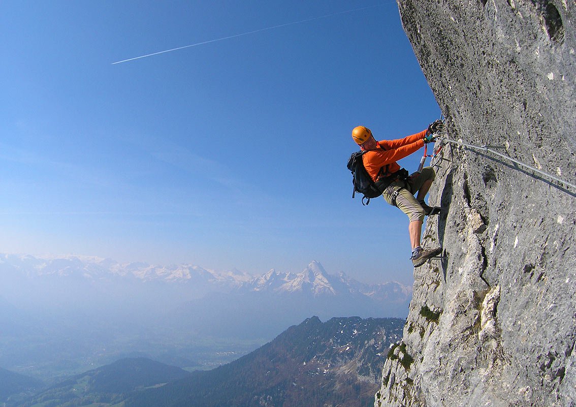 Man muss aber nicht lange den Berg hinauf wandern, um am Königssee Spaß an Klettersteigen zu haben. Sowohl westlich als östlich des bekanntesten Bergsee Deutschlands haben sich zwei tolle Ferrata-Ziele etabliert. Leute mit Armkraft werden eher nach Westen in Richtung Grünstein laufen, dort hat man die Wahl und kann sich von C bis E die mit Stahlseil sehr gut abgesicherten Anstiege aussuchen. Wer es gemütlicher haben will, fährt mit der Jenner Bahn zur Bergstation und steigt zum nahegelegenen Schützensteig (B) ab. Bei diesem quert man - immer mit tollem Watzmann-Königssee-Blick entlang der Felswand zum kleinen Gipfelkreuz. Den leichten Schützensteig (B) hat man vor kurzem etwas anspruchsvoller verlängert, wer den C/D-Schwierigkeitsgrad klettert, kann mit dem sogenannten Laxersteig sein Klettersteigvergnügen beginnen.