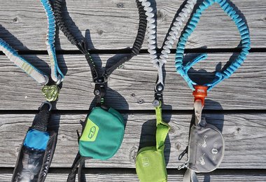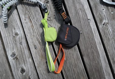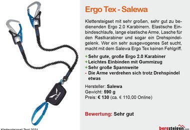 Salewa „Ergo Tex“: Dieses Set wartet schon vor Beginn der Tour mit einer positiven Überraschung auf – es ist fast 70 Gramm leichter als vom Hersteller angegeben! Die großen, gut in der Hand liegenden Ergotec 2.0 Karabiner wurden vom Ergo Zip übernommen (großer, leichter Karabiner). Eine Schlinge für den Rastkarabiner gibt es auch und als Tüpfelchen auf dem i wurde dem Set sogar eine Drehspindel spendiert. Der Bandfalldämpfer ist einen Tick größer als der vom Edelrid Cable Comfort 6.0. Die Karabineröffnung ist nicht die größte aber ordentlich, die Länge der elastischen Arme ist mega, mit dem Set macht das Umhängen zu weiter entfernten Seilen keine Probleme! Das Salewa Ergo Tex ist ein hervorragendes Allround-Set und nur minimal von den Testsiegern entfernt!
