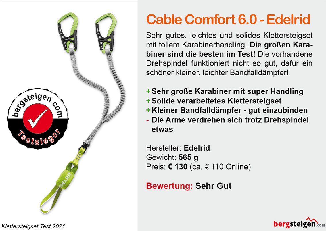 Edelrid „Cable Comfort 6.0“: Edelrid hat sein 5.0 Set wirklich solide verbessert. Der Karabiner ist bei gleichbleibenden Eigenschaften – und das sind die besten – noch leichter geworden! Der Bandfalldämpfer gehört auch zu den kleinsten Teilen auf dem Markt. Ein solides, qualitativ hochwertiges Set, welches vor allem durch seine Karabiner heraussticht. Diesmal haben wir lange überlegt, wäre da nicht das zusätzliche Drehgelenk, welches aber nicht so gut funktioniert – das Edelrid Cable Comfort 6.0 wäre mit großem Abstand Testsieger geworden. Da aber das Verdrehen der Arme beim Klettersteiggehen wirklich eine nervige Sache ist, gab es dieses Jahr gemeinsam mit dem Kinetic Cyro Rewind Pro von Camp einen Doppelsieg.