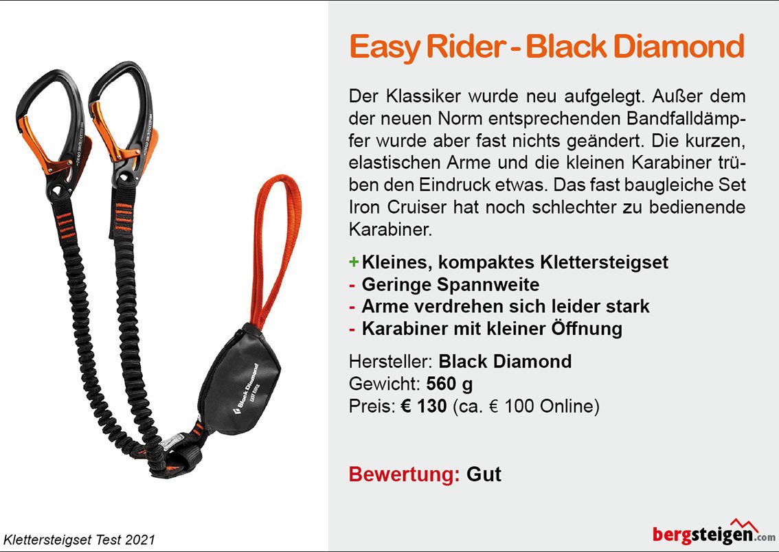 Black Diamond „Easy Rider“: Vor über zehn Jahren war das Easy Rider Klettersteigset mit seinem Handballenkarabiner das Non-Plus-Ultra auf dem Markt. In der heutigen Zeit kann man aber mit kleinen Karabinern, die noch dazu eine sehr kleine Öffnung haben und zu kurzen elastischen Armen keinen Eindruck mehr schinden. Eigentlich schade, dass an diesem Klassiker nicht mehr weiter entwickelt wird. Auch das bis auf die Karabiner baugleiche Iron Cruisser Klettersteigset hat bis auf den neuen, normgerechten Bandfalldämpfer keine wirkliche Innovation erfahren.