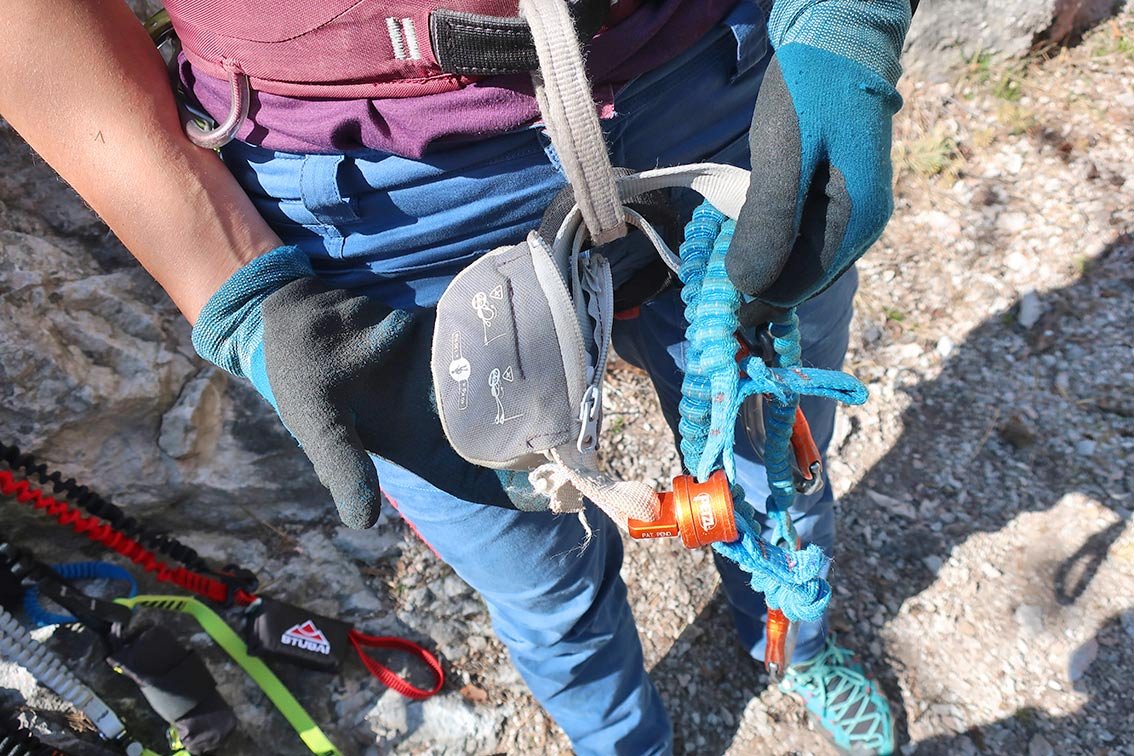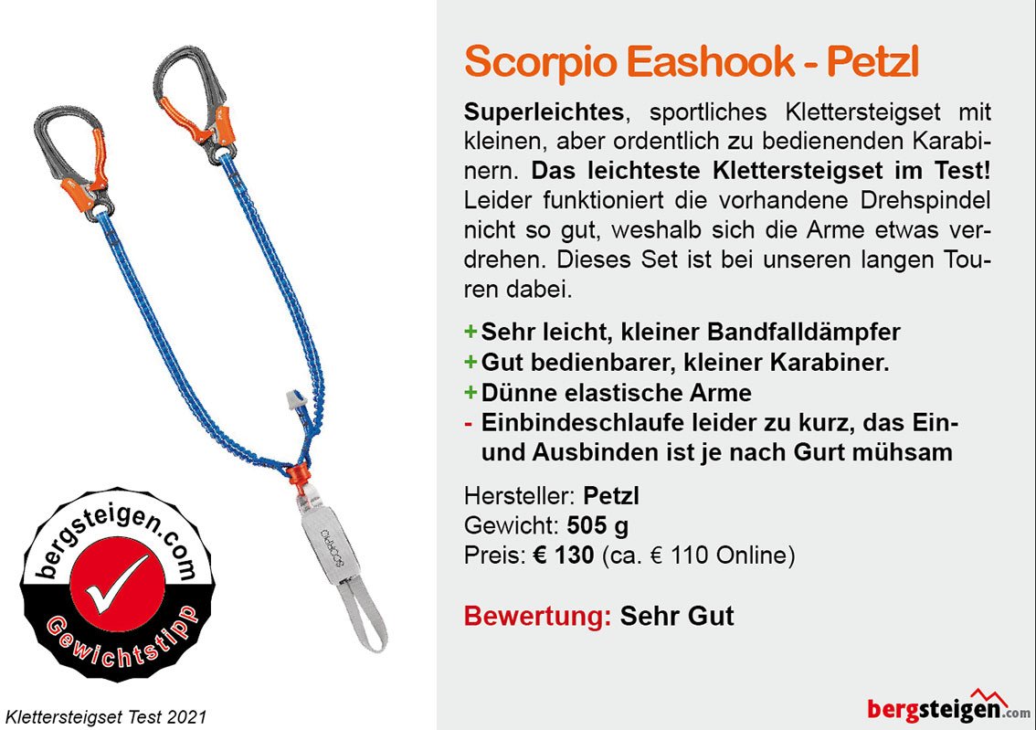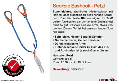 Petzl „Scorpio Eashook“: Bei diesem Set ist die Einbindeschlaufe etwas zu kurz geraten – vor allem beim Entfernen (Ausbinden) des Klettersteigsets ist es trotz Öffnen des Bandfalldämpfer-Reißverschlusses (laut Gebrauchsanweisung ist das nötig) etwas tricky (bei Klettergurten mit schmalen Anseilschlaufen geht das Einbinden besser!). Für diejenigen, die aber nur Klettersteige gehen und das Set immer am Klettergurt lassen, entfällt das Ein- und Ausbinden. Der Karabiner ist kleiner, lässt sich aber trotzdem erstaunlich gut bedienen. Die orange Alu-Drehspindel funktioniert aber nicht gut. Das Petzl-Set hat aber einen sehr großen Pluspunkt, es ist super leicht und kompakt! Alpinisten werden diesen Umstand positiv zu schätzen wissen, denn auf langen Klettersteigtouren tut man sich mit leichter Ausrüstung naturgemäß einfach etwas leichter.