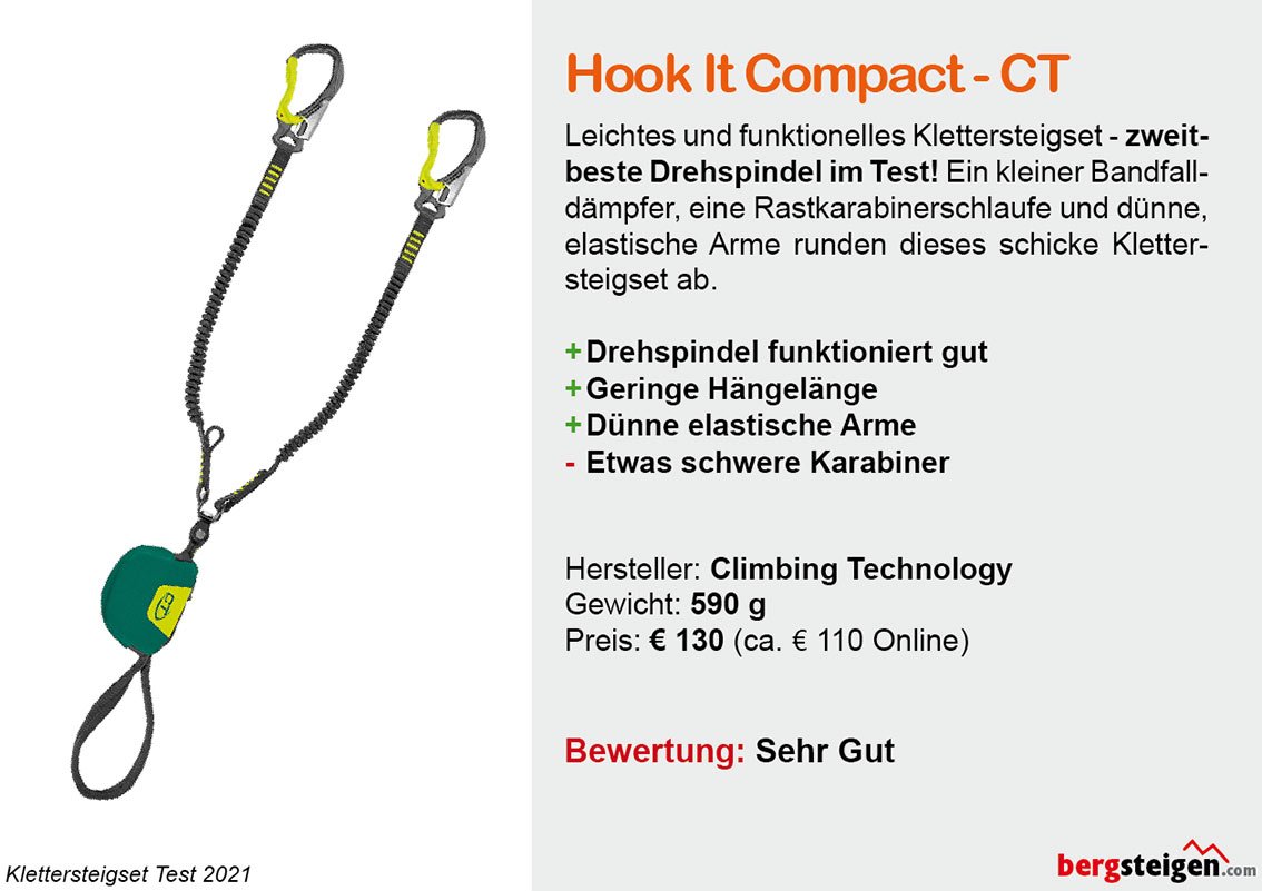 Climbing Technology Hook It Compact: Leichtes, kompaktes und gut durchdachtes Klettersteigset, das vor allem durch seine Drehspindel positiv heraussticht! Diese ist nicht ganz auf dem Niveau des Camp Ferrata-Sets, funktioniert aber doch recht gut. Die elastischen Arme verdrehen sich nicht so stark, bei kompletter Entlastung gibt es aber eine kleine Gegenbewegung. Die elastischen Arme wurden direkt an der Drehspindel getrennt, das dürfte der Schlüssel zum Teilerfolg gewesen sein. Das Set hat eine gute Figur auf der Teststrecke gemacht, lässt sich sehr kompakt im Rucksack verstauen. Den Italiener ist ein sehr schönes Klettersteigset gelungen, vor allem die kompakte Bauweise und die recht gut funktionierende Drehspindel wird die Käufer dieses Sets freuen.