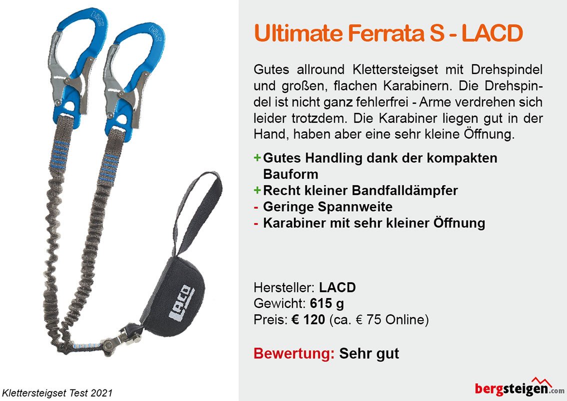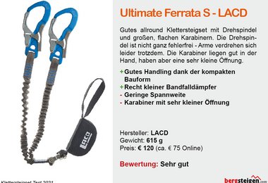 LACD „Ultimate Ferrata S“: Das LACD Ferrata Set macht einen recht unscheinbaren Eindruck, ein recht kleiner Bandfalldämpfer, ein nicht gut funktionierender Wirbel - der aber das Entwirren der verdrehten Arme erleichtert und große, formschöne Karabiner. Der Karabiner hat eine recht kleine Öffnung, kommt aber komplett ohne Plastikanteile aus. Leider ist die Spannweite recht gering. Das Ultimate Ferrata S tut auf dem Klettersteig was es soll, nicht mehr und nicht weniger. Preislich ist das Drehwirbel-Set auch noch unter der 120 Euro Marke angesiedelt.