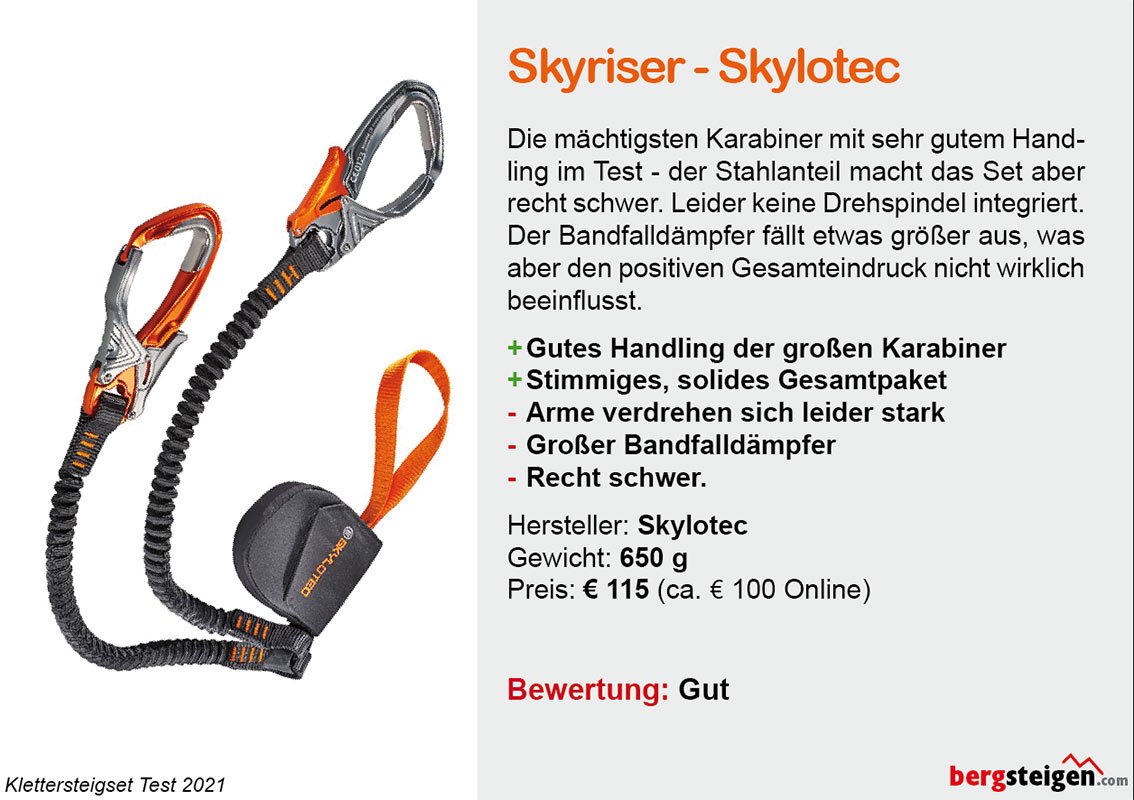 Skylotec „Skyriser“: Die Karabiner sind die formschönen „Monster“ beim diesjährigen Klettersteigtest, liegen perfekt in der Hand und auch der Schließmechanismus lässt sich sehr gut bedienen. Der Karabiner ist zusätzlich noch bei der Reibfläche mit Stahl verstärkt – ein langes Leben ist diesem Metallteil garantiert. Naturgemäß wiegt Stahl mehr als Aluminium, das Klettersteigset ist recht schwer. Der Bandfalldämpfer gehört zu den größeren, wegen der langen Einbindeschlaufe geht das Einbinden aber trotzdem noch gut. Auf einen Drehwirbel, welcher zumindest das Ausdrehen der verdrehten Arme erleichtern könnte, wurde verzichtet. Das Skyriser Klettersteigset ist ein guter Allrounder, an dem man sicher lange Freude haben wird.