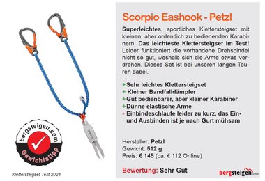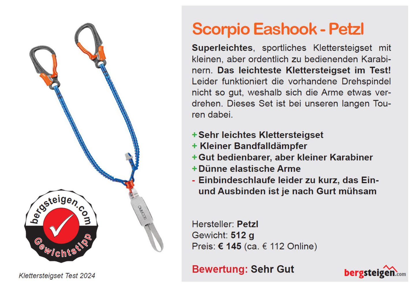 Petzl „Scorpio Eashook“: Bei diesem Set ist die Einbindeschlaufe etwas zu kurz geraten – vor allem beim Entfernen (Ausbinden) des Klettersteigsets ist es trotz Öffnen des Bandfalldämpfer-Reißverschlusses (laut Gebrauchsanweisung ist das nötig) etwas tricky (bei Klettergurten mit schmalen Anseilschlaufen geht das Einbinden besser!). Für diejenigen, die aber nur Klettersteige gehen und das Set immer am Klettergurt lassen, entfällt das Ein- und Ausbinden. Der Karabiner ist kleiner, lässt sich aber trotzdem erstaunlich gut bedienen (sehr gut für kleine Hände!). Die orange Alu-Drehspindel funktioniert leider nicht so gut. Das Petzl-Set hat aber einen sehr großen Pluspunkt, es ist das leichteste Set im Test und sehr kompakt! Alpinisten werden diesen Umstand positiv zu schätzen wissen, denn auf langen Klettersteigtouren tut man sich mit leichter Ausrüstung naturgemäß einfach etwas leichter.