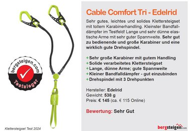 Edelrid „Cable Comfort Tri“: Edelrid hat sein 6.0 Set mehr als deutlich verbessert. Herzstück ist die 3-fach Drehspindel, die auch wirklich gut funtioniert. Der große Karabiner ist bei gleichbleibenden Eigenschaften noch leichter geworden! Der Bandfalldämpfer gehört auch zu den kleinsten Teilen auf dem Markt. Schön und angenehm sind auch die dünnen, elsastischen Arme, welche solide und sehr eng abgenäht sind, auch das Gewicht von 538 Gramm kann sich sehen lassen! Ein solides, qualitativ hochwertiges Set, welches als einziges 2024 Klettersteigset in allen Bereich wirklich gut punktet. Das Cable Comfort Tri Klettersteigset: Große Karabiner, dünne Lastarme, kleinster Bandfalldämer und sehr gute Drehspindel