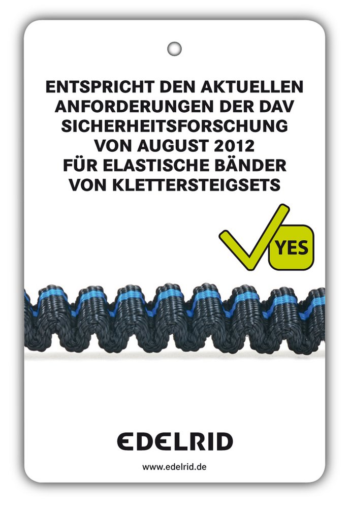 Die elastischen Karabineräste der vorsorglich zurückgerufenen Klettersteigsets (KSS) werden seit dem 03. September 2012 von Edelrid ausgetauscht. Nach einer Vielzahl von Material- und Langzeittests sind die Vorteile einer neuen Materialzusammensetzung für die elastischen Äste klar ersichtlich. Die ausgetauschten Karabineräste weisen ein Sicherheitsplus auf und sind leicht an der neuen Farbgebung zu erkennen; das schwarze Band trägt auf der einen Seite einen grünen, auf der anderen einen blauen Streifen.