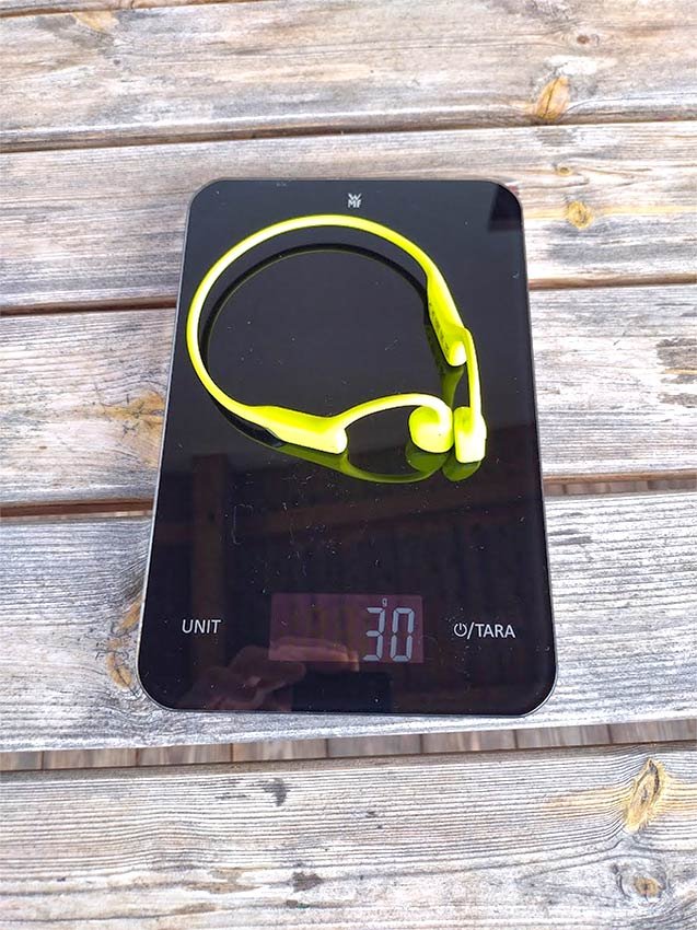 Kommen wir nun zum Klang - sicher sind bei In-Ear-Kopfhörern die Bässe etwas besser (da ja auch direkt im Ohr), wir waren aber positiv überrascht, dass der Sound beim Suunto Sonic im Vergleich mit In-Ear-Hörern nicht merkbar schlechter ist. Für das Plus an Sicherheit - da man die Umgebungsgeräusche auch zusätzlich wahr nimmt - ist der Suunto Sonic sehr gut und wir wechseln nicht mehr zu den Ohrstöpseln zurück. Man gewöhnt sich auch schnell an die außen anliegenden Kopfhörer, die mit 31 Gramm nicht wirklich schwer sind, einen Tag damit unterwegs und man merkt fast nicht mehr, dass man diese außen am Ohr hat.