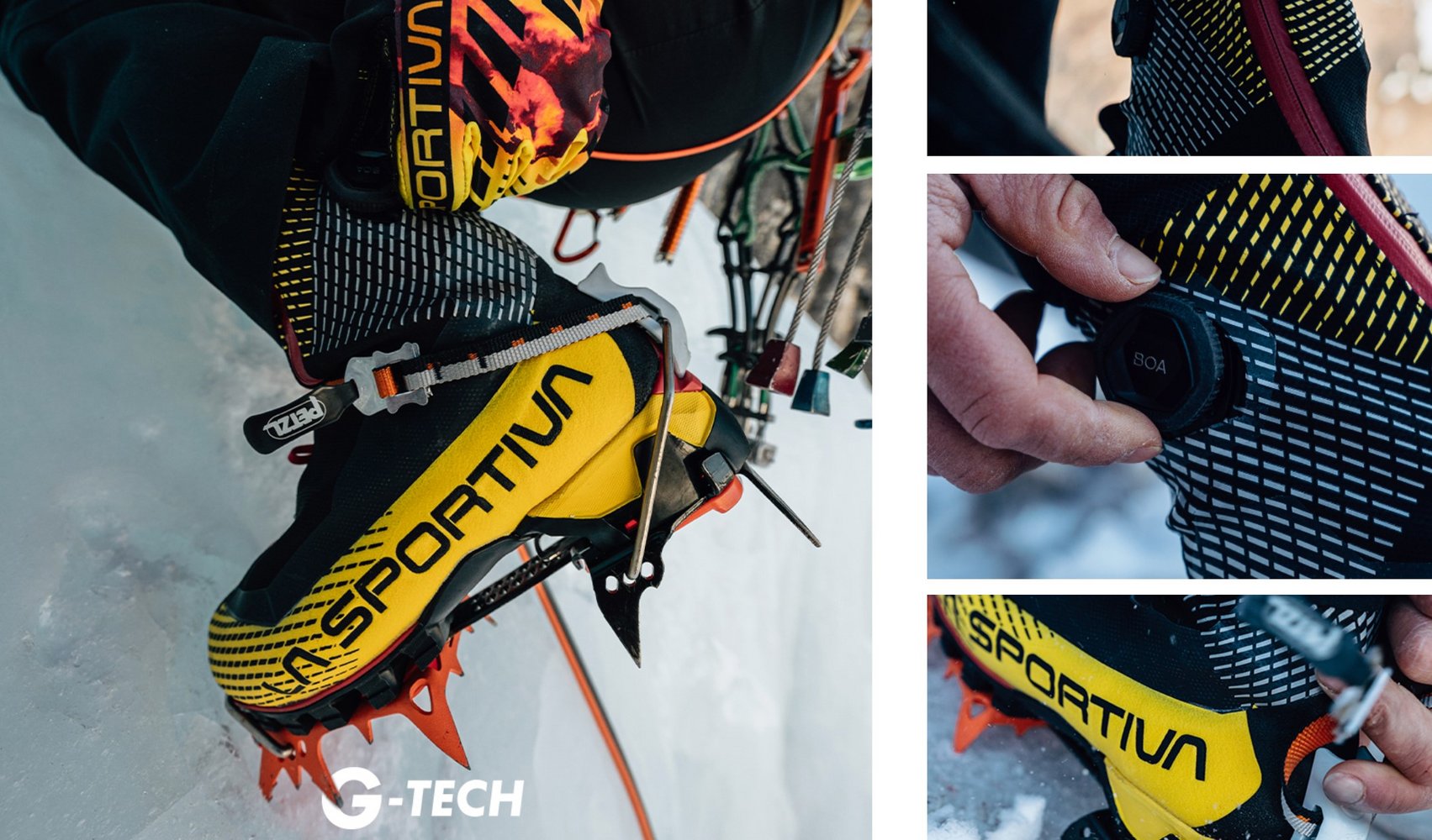 Die beiden Schuhe ähneln sich zwar äußerlich, unterscheiden sich aber in ihrem Verwendungszweck und ihren technischen Merkmalen, während sie sich in Bezug auf bestimmte Konstruktionen und Materialwahl überschneiden. Der G-Tech ist unglaublich leicht und wurde für das spezialisierte Eisklettern an Eisfällen und das moderne Mixed-Klettern entwickelt, während der G-Summit Schuh für das Bergsteigen in großen Höhen mit vertikalen und stark exponierten Abschnitten gedacht ist. Beide verfügen über eine Konstruktion mit Core-Wrap™-Technologie für maximalen Komfort und Wärmeisolierung und BOA® Fit System-Verschluss für eine präzise und schnelle Anpassung.