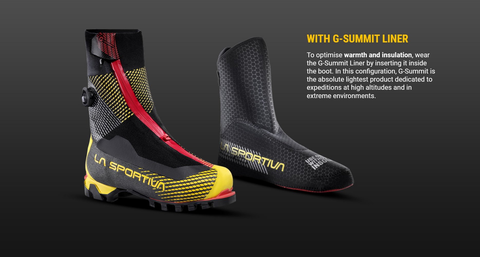 Mit dem G-Summit hat das La Sportiva Footwear R&D Team wieder einmal alle Anstrengungen unternommen, um ein fortschrittliches und revolutionäres Produkt zu entwickeln, das in enger Zusammenarbeit mit unseren Athleten und externen Labors entstanden ist, um grundlegende thermische und leistungsbezogene Daten zu sammeln.