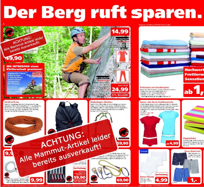 Überrascht war die Mammut Sports Group Austria GmbH als Interspar letzte Woche in seinem Flyer den Verkauf von Klettergurten und Expressschlingen von Mammut ankündigte.