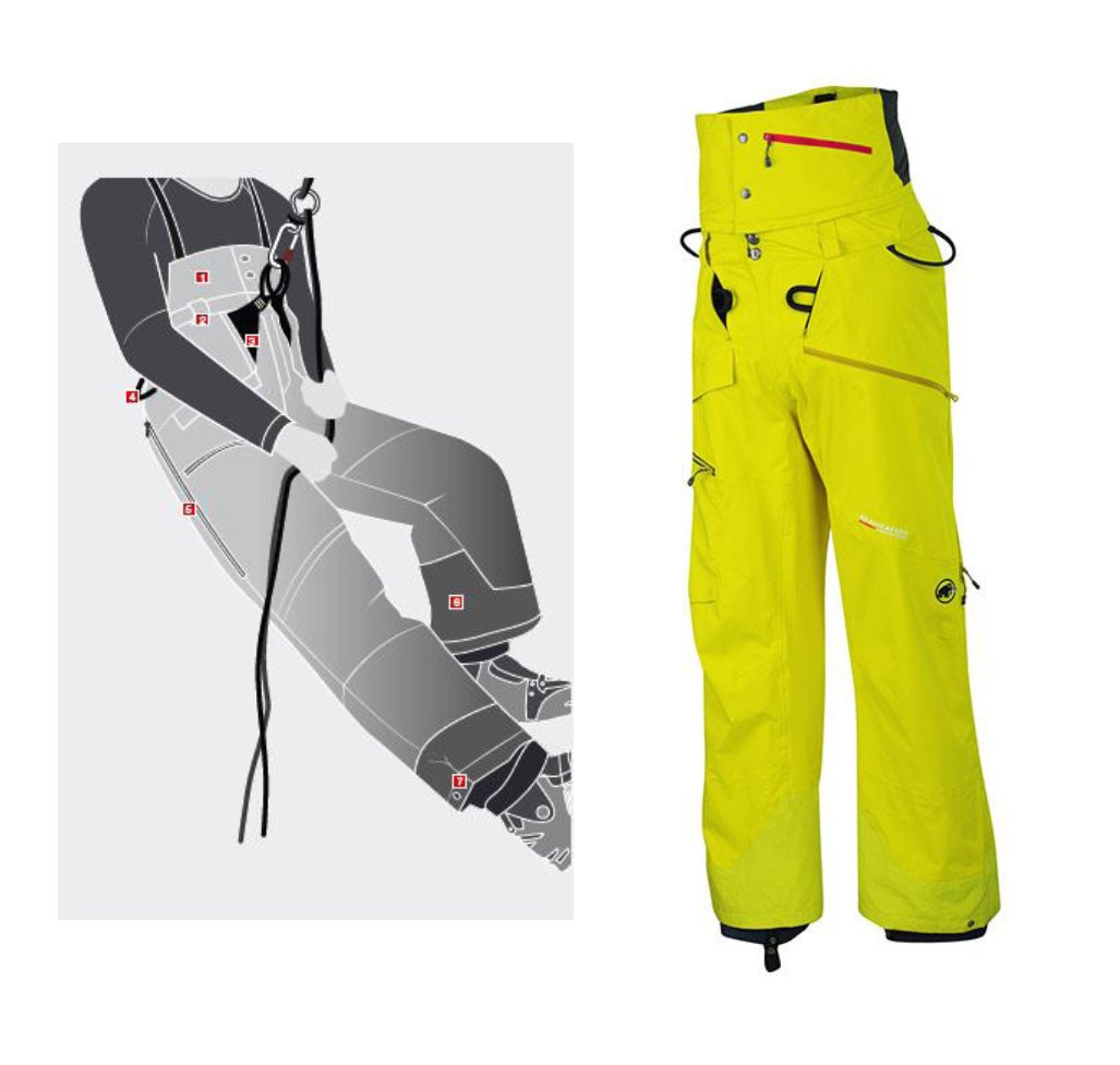 Im Vergleich zu bestehenden Konzepten, wo einfach eine Hose über einem Gurt getragen wird, wartet die Alyeska GTX® Pro Realization Pants mit einer komplett in die Innenhose integrierten, lasttragenden Klettergurtstruktur auf. Die Mammut Split Webbing Technologie in der Hüftgurt- und Beinschlaufenkonstruktion sorgt dabei, wie auch beim Hightech-Gurt Zephir, für den nötigen Tragekomfort. Diese inneren Werte sind von aussen kaum ersichtlich. So entsteht ein beispielloser, cooler Look, der sowohl auf dem Weg zum Freeriden als auch beim Après-Ski getragen werden kann.