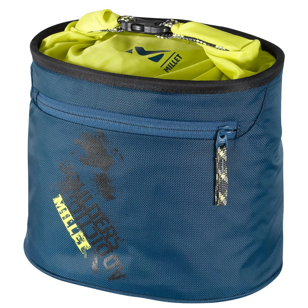 DieIt-Bags für Urban Climbers: Der Fleece gefütterte Ergo Chalk Bag mit exklusivem Millet „Queen of Rocks“ Design lässt sich per Kordelzug staubdicht verschließen und kann wahlweise per Karabiner oder Gürtel mit Schnallenverschluss befestigt werden. Er verfügt über eine Boulderbürstenhalterung und kostet 19,90 Euro.
