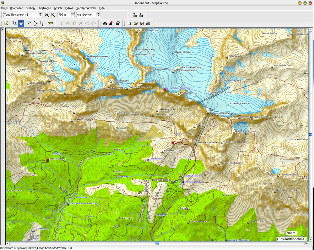Höhenlinien und über 800 gespeicherte Positionen von Schutzhütten