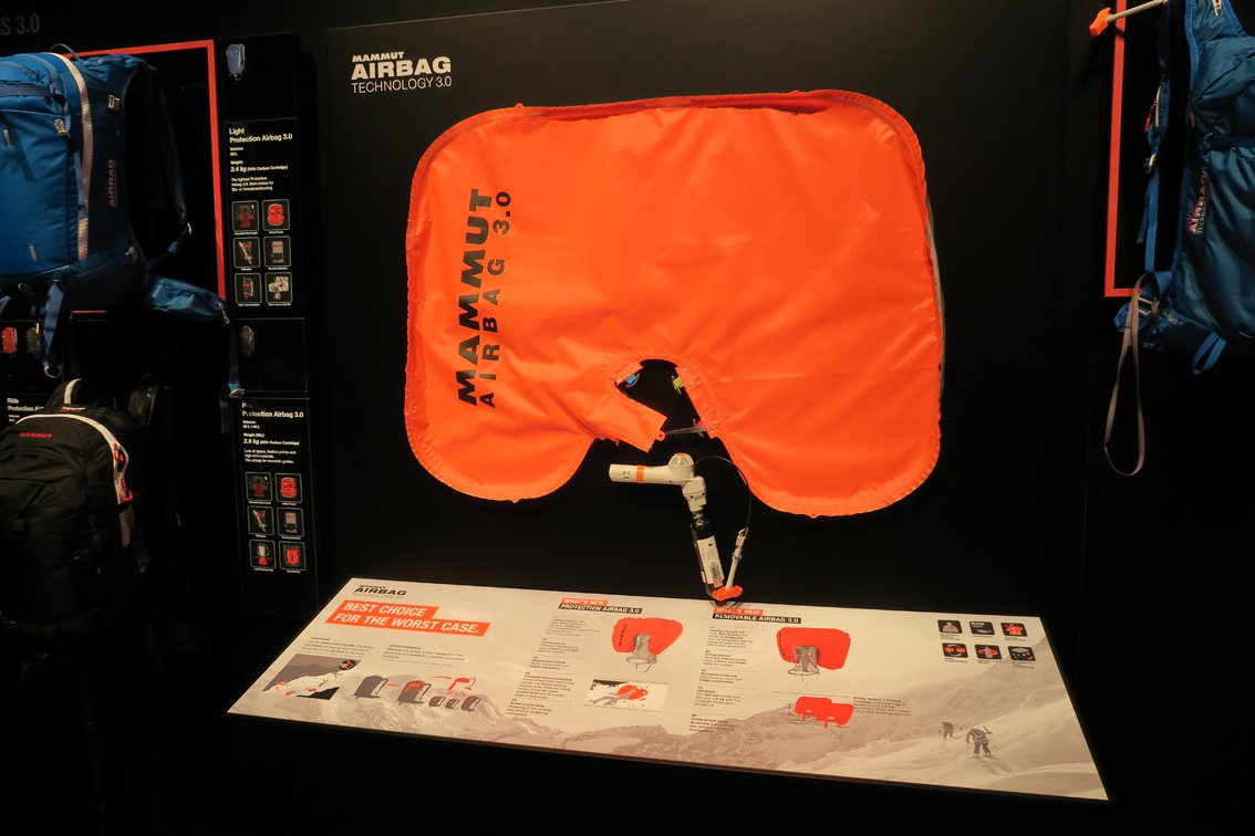 Auch komplett überarbeitet wurde das Light Protection Airbag 3.0 System von Mammut. Dieses System, bei dem auch der Kopf von den Airbagballons geschützt wird, hat 30 Liter Stauraum. Der Airbag und die Kartusche lassen sich komplett entfernen, so kann man den Rucksack auch für Sommertouren sehr gut verwenden. Der Rucksack mit seinen leichten Aluminium Rahmen sorgt für eine gute und ausgewogene Lastübertragung, die neu gestalteten Schulterträger und der thermogeformte Rücken sorgen zusätzlich für guten Tragekomfort.