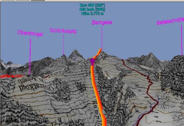 Sehr schönes Feature sind vor allem die guten Orthofotos, die man wahlweise mit der Karte wechseln kann. Diese werden – ähnlich wie in Google Earth auch 3-Dimensional dargestellt. So ist es z.B. möglich, seinen GPS-Track nach der Erstellung auch dreidimensional abzufliegen. Schön und vor allem hilfreich bei der Tourenplanung sind auch die unterschiedlichen Farbgebungen beim „Trackflug“.