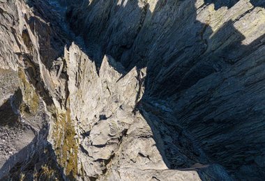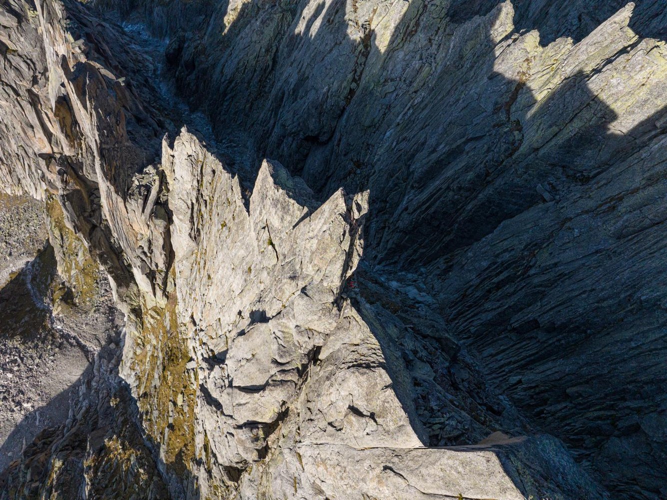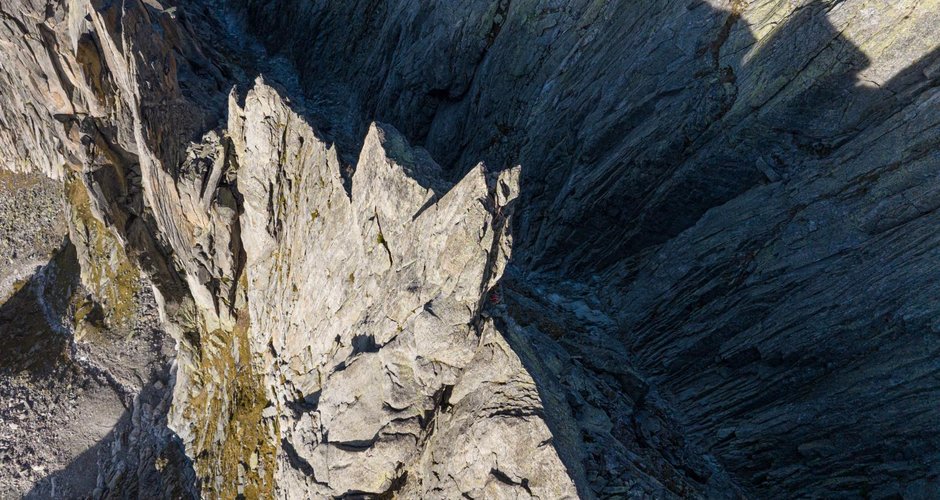 Schnell seilten sie sich über die Südwand ab, um in die Zahnscharte des Südgrates zu kommen. Von da waren es nochmal zwei Abseilstellen und ein kurzer Fussmarsch zum Einstieg des zweiten Grates. Auch diesen kletterten sie simultan, wobei Simon den Anfang machte bis zur Zahnscharte und Yannick den Rest bis zur Gipfelnadel im Vorstieg war. Sie liessen ein Seil in der Abseilstelle von der Gipfelnadel, um später Zeit zu sparen und weil sie den Ostgrat seilfrei klettern würden, mit Ausnahme der Schlüsselpassage. Um dieselbe Strecke zu klettern wie der Rekordhalter, wählten sie den Originaleinstieg zum Ostgrat, der etwas höher liegt als der Direkte Einstieg.