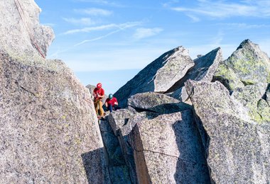 Der Dienstag, 3. Oktober wurde dem Salbit-Westgrat gewidmet. Dieser ist von der Schwierigkeit, Länge und den technischen Anforderungen der anspruchsvollste. Gleich im Anschluss kletterten sie den unteren Teil des Südgrats. Für die heiklen Kletterpassagen wurde Technik und Strategie im Vorfeld besprochen und entschieden, um später die maximale Sicherheit bei minimalem Zeitverlust sicherzustellen.