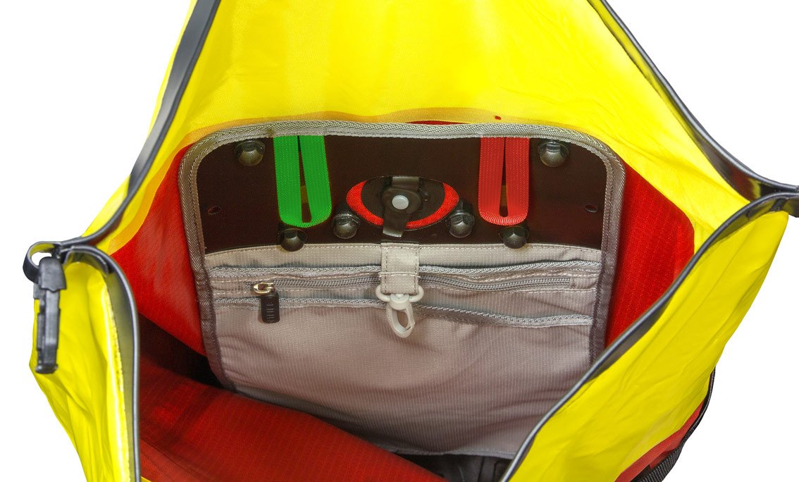 Der Elevation Pro2 wurde von der Österreichischen Bergrettung zusammen mit Ortlieb realisiert. Das ("Rettungs-")Modell ist rot, das zivile Modell ist schwarz - bis auf die Farbe sind die Rucksäcke aber baugleich. Was sofort auffällt ist das robuste, abriebfeste und wasserfeste Material des Elevation Pro2, dieser Rucksack entspricht dem IP 64 Standard, er ist also Staubdicht und gegen Spritzwasser geschützt.