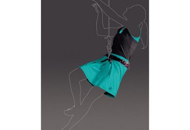 Der Skort («skirt» und «short») ist ein kurzer Rock mit eingearbeiteten Shorts. Dieses neue Kleidungsstück vereint Technologie mit femininem Stil. Auf dem angenehm breiten Bund wird der Hüftgurt des Klettergurtes platziert. Darauf befestigt ist ein leicht ausgestellter Rock mit Falte und Schlitzen im vorderen Bereich. Darunter befindet sich eine kurze enge Hose, auf der die Beinschlaufen des Gurtes positioniert werden. Der Rockteil verdeckt diese und ergibt eine neue, feminine Silhouette für jede Kletterin.